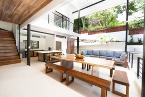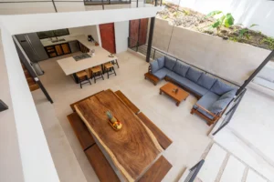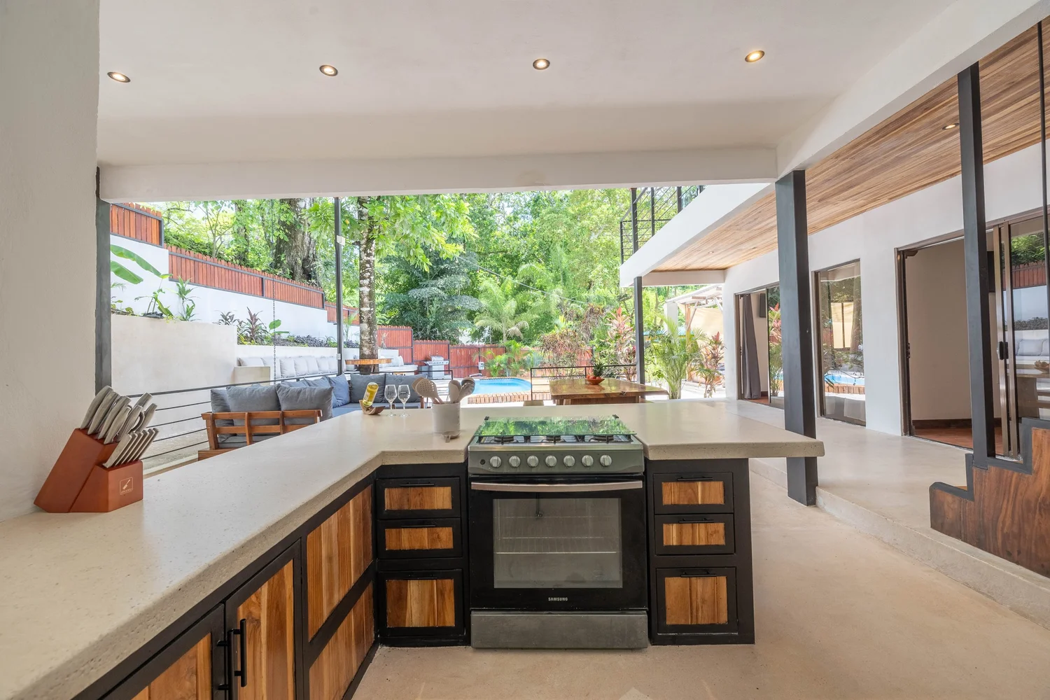 Filled with natural light, the home features a large open kitchen and dining area overlooking the jungle, creating an inviting space to gather, relax, or enjoy a quiet morning coffee. Each of the seven en-suite bedrooms has its own private entrance and lock, giving guests the flexibility and personal space that make a real difference for retreats, remote work stays, group trips, and family vacations. The villa includes king and queen beds, a sofa bed, and dedicated work areas, with three bedrooms also offering private desks.